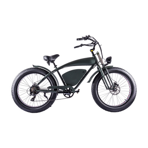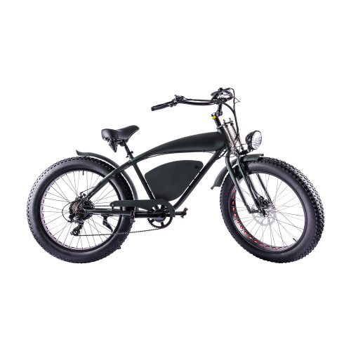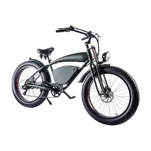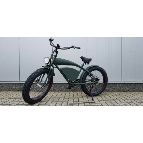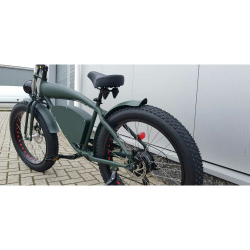 De Vintage Cruiser e-bike heeft een robuust en stoer design. Deze vintage cruiser is met zijn brede banden en optie tot rode velgen geïnspireerd op de echte Hot Rod cruisers. De elektrische fiets heeft een extra stevig frame met een draagvermogen van 315 kg. Het brede stuur en grote zadel met vering zorgen voor een goed fietscomfort. De extra brede banden maken de fiets geschikt om ook op onverharde wegen en het strand te fietsen. Tevens is deze vintage e-bike voorzien van V-brakes en een zijstandaard, lcd scherm, trip modus, etc. De perfecte Ecruiser fiets dus!