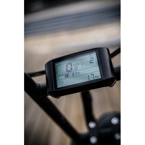 Het hart van iedere elektrische fiets is natuurlijk de elektromotor. Die wordt hier gevoed door een LG Li-ion accu die een actieradius heeft van ruim 80 kilometer in economy mode. Zo kun je dus een flinke afstand afleggen tot je moet bijladen. De accu is uitneembaar wat een praktische toevoeging is. De kop- en achterlamp zijn voorzien van LED’s. Dat is lekker zuinig en ze bieden optimaal zicht in het donker. Het digitale display past perfect bij de moderne styling van het frame. Je ziet naast de snelheid ook de accustatus, of de verlichting ingeschakeld staat en andere informatie. Standaard is er een USB poort aanwezig waarmee je bijvoorbeeld een smartphone van de nodige ‘juice’ kunt voorzien. Dat is bijvoorbeeld handig als je een navigatie app gebruikt.